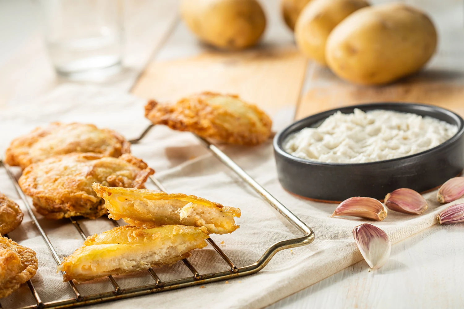 Thin slices of natural potato filled with a smooth and creamy cod brandade, lightly coated to achieve a crispy and golden finish. A balanced combination of land and sea that evokes the most authentic Mediterranean cuisine. Ideal to serve as a tapa, starter, or side dish with character and artisanal flavor.