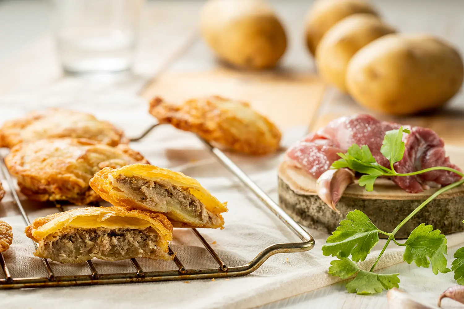 Stuffed potatoes are handmade: every two potato slices are stuffed with high quality roasted meat and covered in a thin egg layer. Original combination and presentation.
